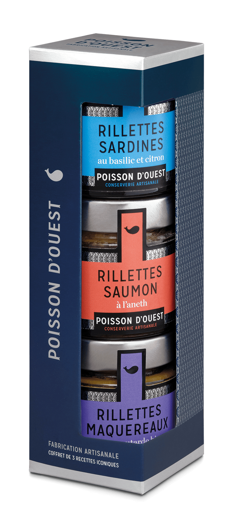 Un coffret iconique de la marque Poisson d’Ouest, 3 rillettes artisanales : 1 rillettes de sardines au basilic et citron, 1 rillettes de saumon fumé “maison”, 1 rillettes de maquereaux à la moutarde bio.